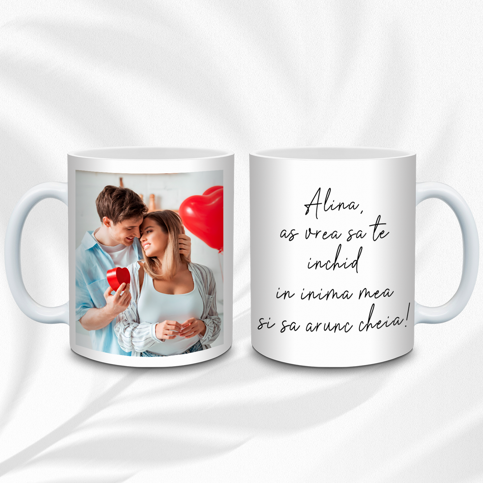 Transformă-ți sentimentele în cel mai dulce gest cu o cană personalizată cu poză și mesaj romantic, perfectă pentru a-ți surprinde persoana iubită! Adaugă fotografia voastră preferată și un mesaj emoționant – precum „Alina, aș vrea să te închid în inima mea și să arunc cheia!” – și creează un cadou memorabil, cu adevărat unic.