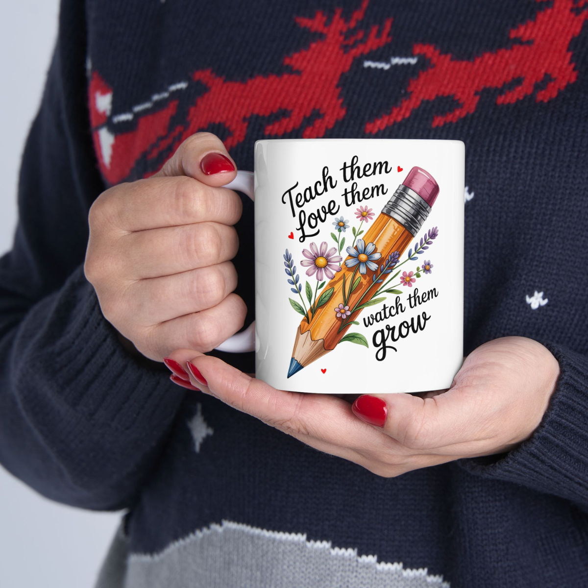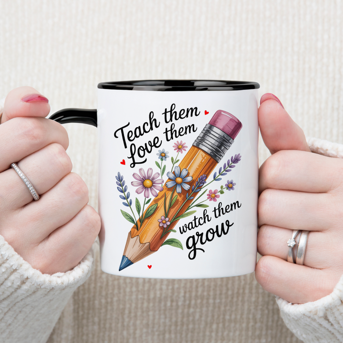 Cana cadou pentru profesori si educatori – ilustratie creion si flori cu mesaj „Teach them, Love them, Watch them grow” – cana cadou personalizat ceramica 330ml