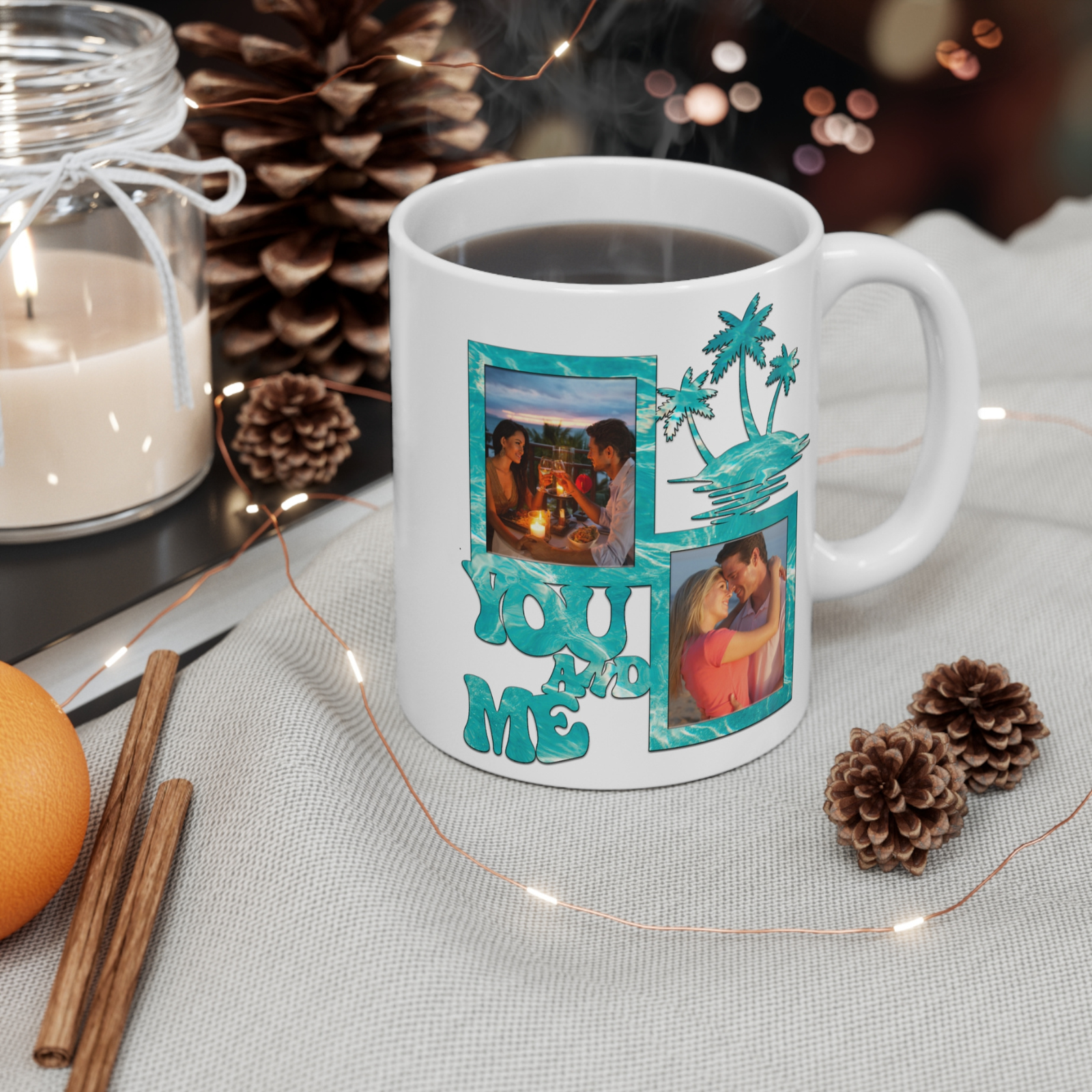 Cană ceramică cu tematică romantică, decorată cu colaje foto de cuplu la plajă și textul „You and Me” – un cadou ideal pentru Ziua Îndrăgostiților, aniversări sau vacanțe romantice. Design elegant cu palme și apus de soare, imprimat rezistent și viu colorat.