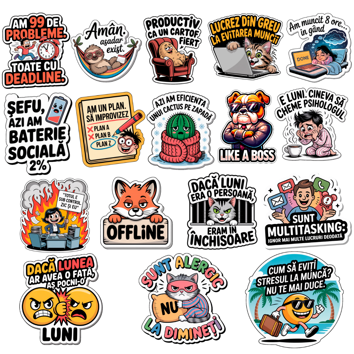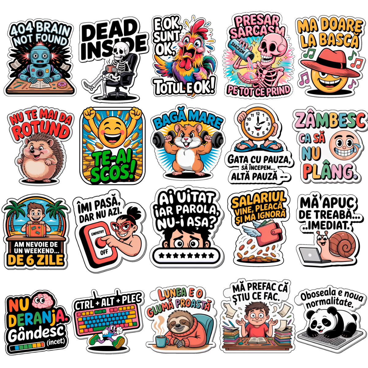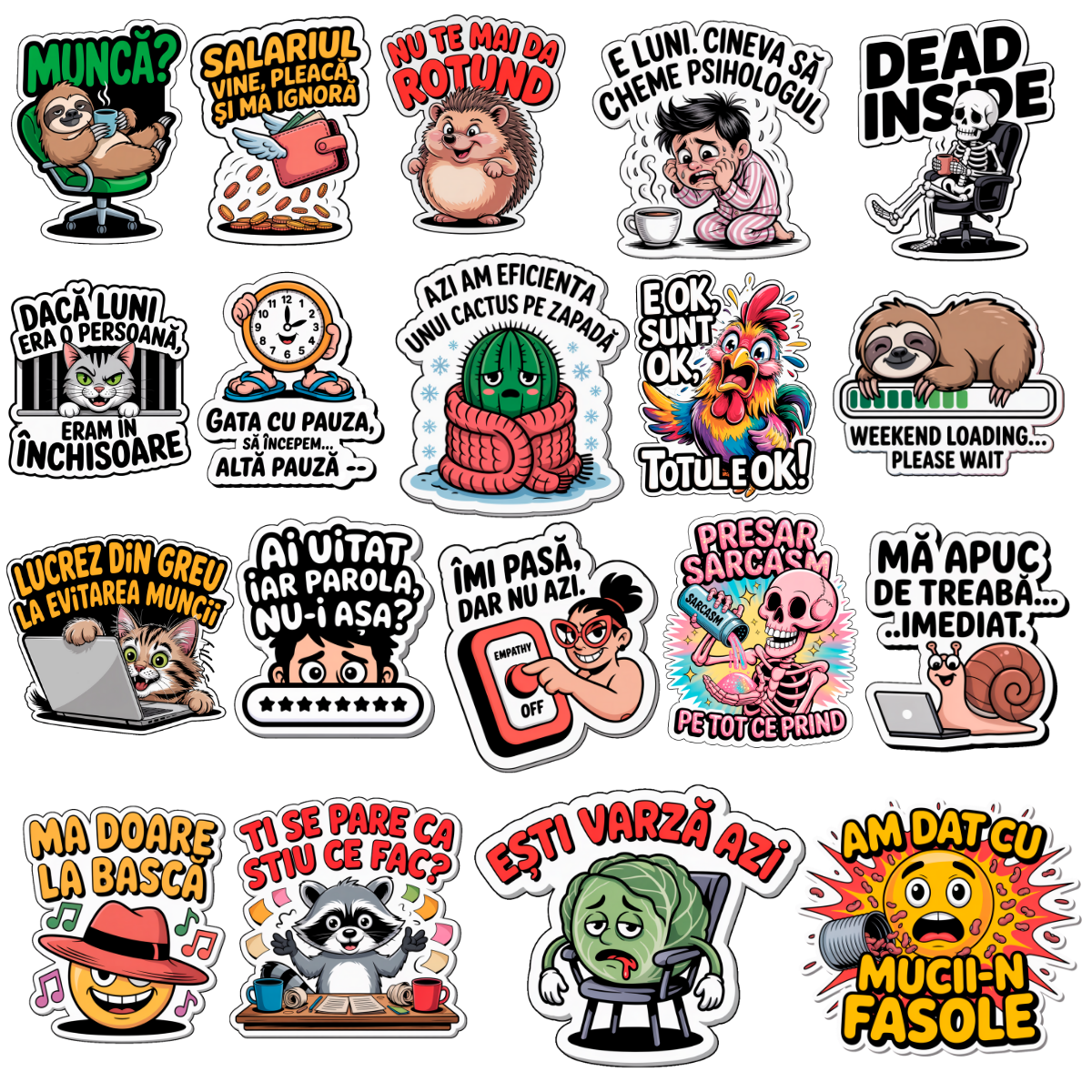 Transformă orice obiect într-o piesă unică cu setul de 50 stickere decorative HappyMi – combinația perfectă de umor, sarcasm și motivație.